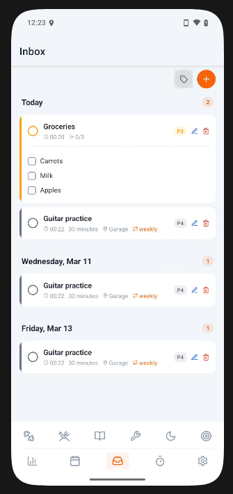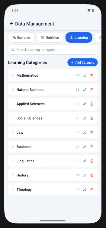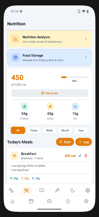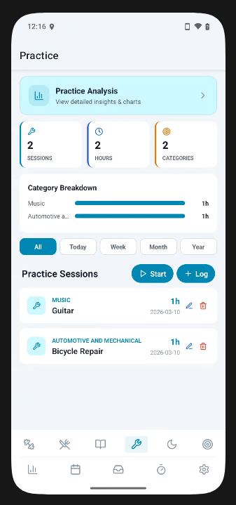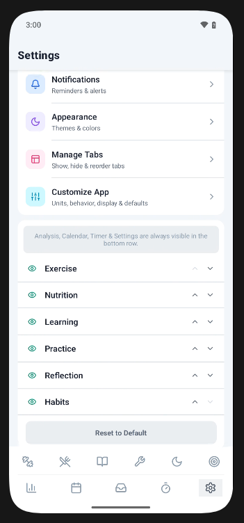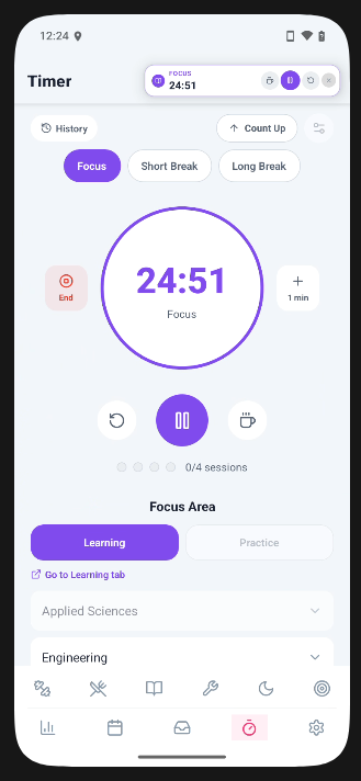 Select from a Pomodoro or count-up timer for better focus on activities. Timers can also be started from exercise, nutrition, learning, and practice tabs.