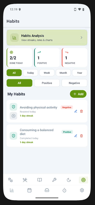 With native tracking and built-in analysis mechanisms tailored for exercise, nutrition, learning, practice, reflecting, and habits, users can both track and review their progress and status with all of them easily within reach of each other.